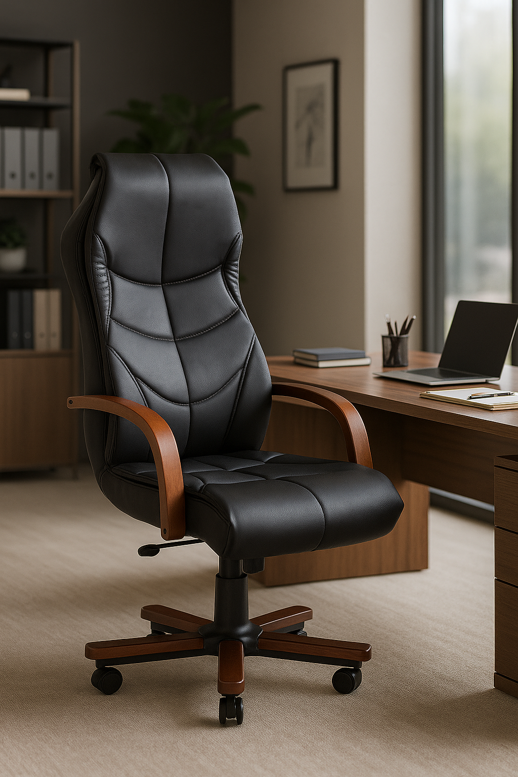 - Şık Ahşap Detaylar: Ahşap kolçaklar estetik bir görünüm katar, ofis ortamına lüks bir hava getirir.