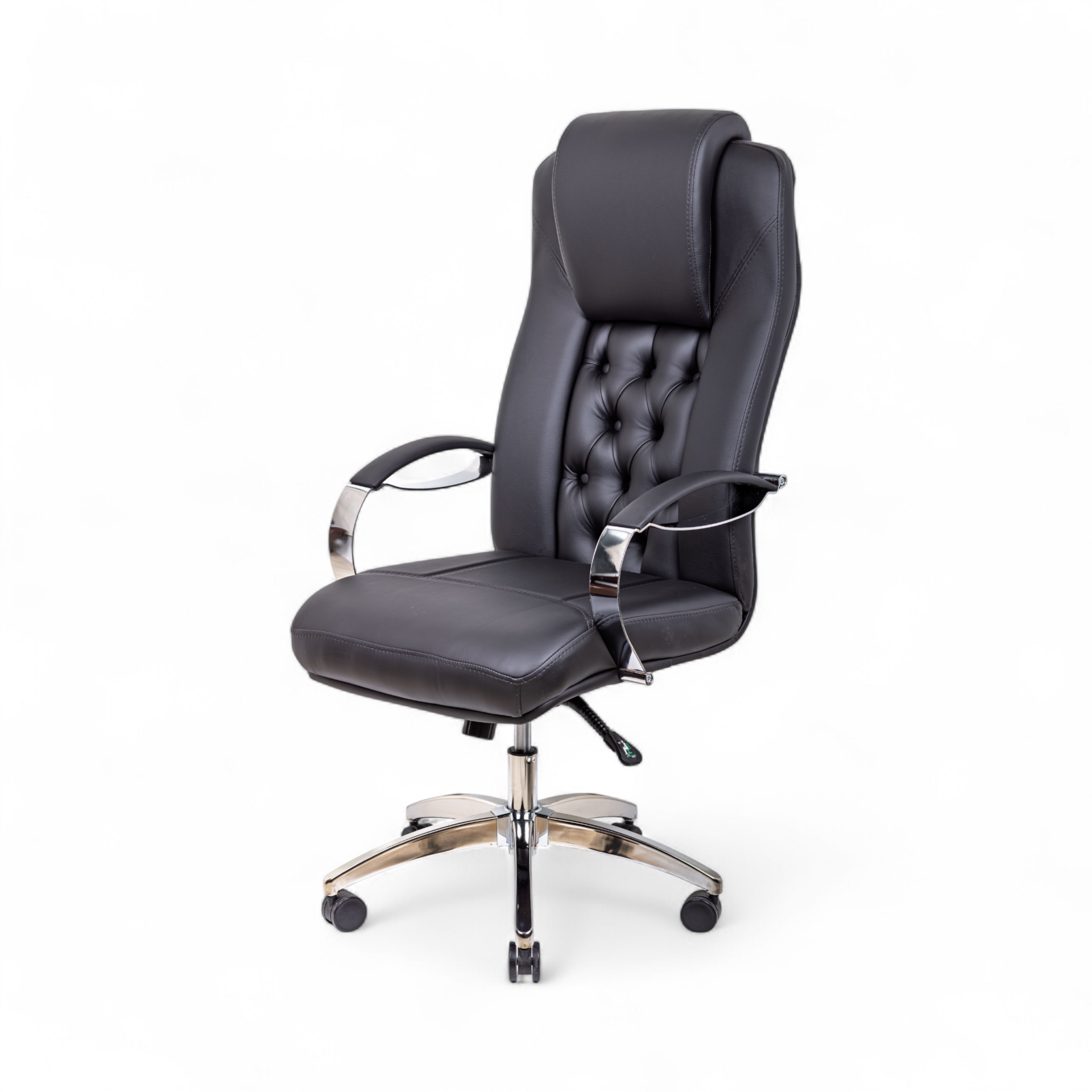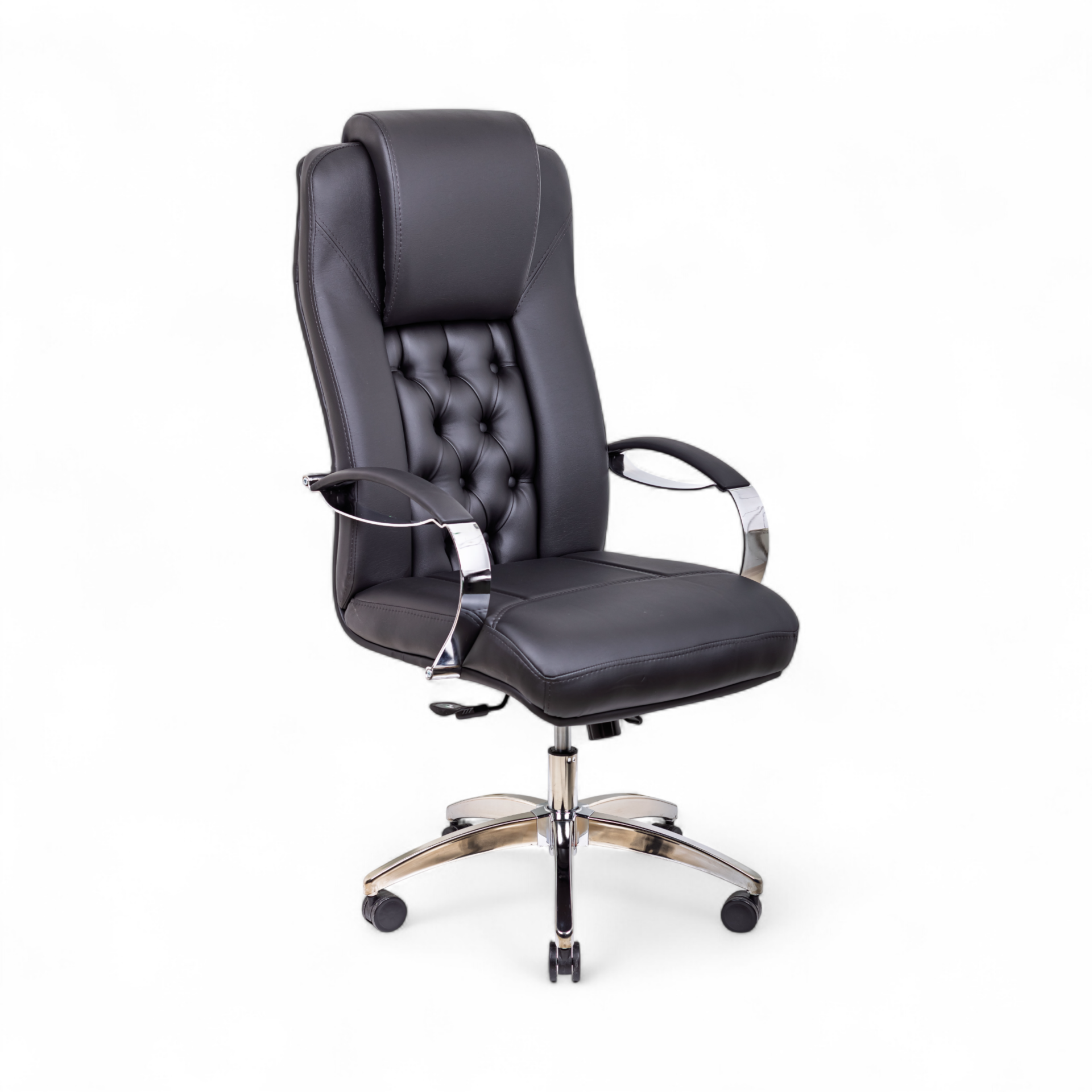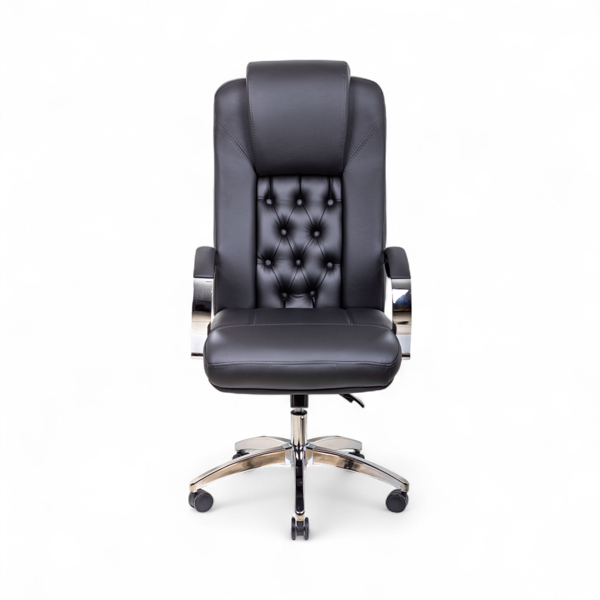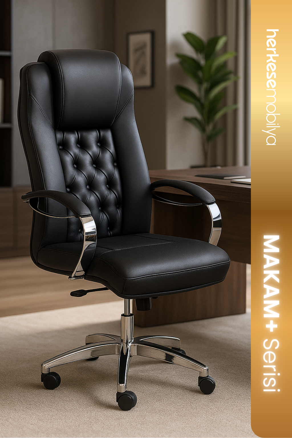 Burea Yönetici Koltuğu, klasik Chesterfield tarzının zamana meydan okuyan estetiğini modern ofis konforuyla birleştiren, lüks bir makam koltuğudur. Sırt kısmındaki göz alıcı kapitone dikiş detayları, koltuğa derinlik ve asil bir karakter kazandırarak ofisinizde saygın bir atmosfer yaratır. Siyah derinin profesyonel duruşu, parlak krom detaylarla birleşerek güçlü bir tasarım dili oluşturur.