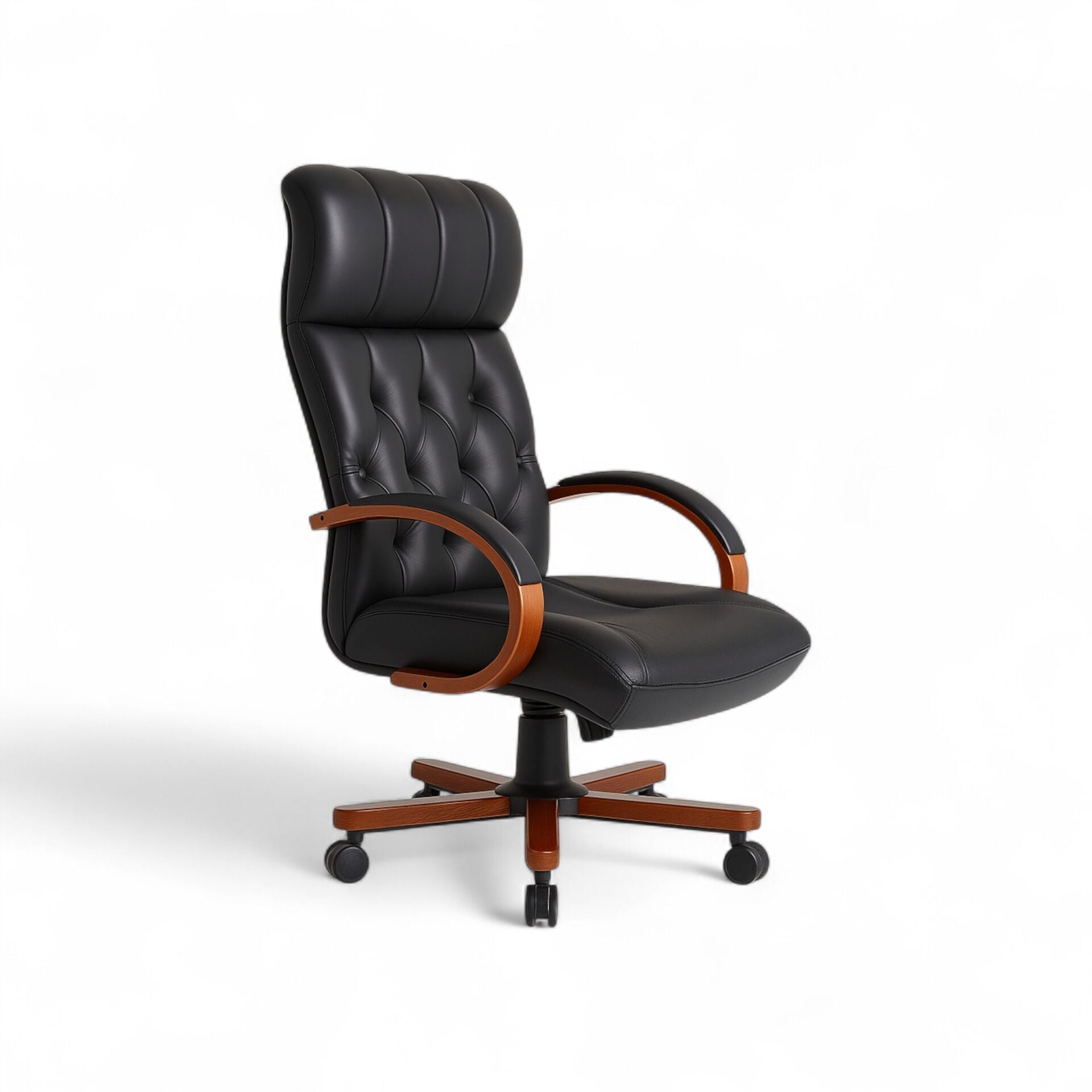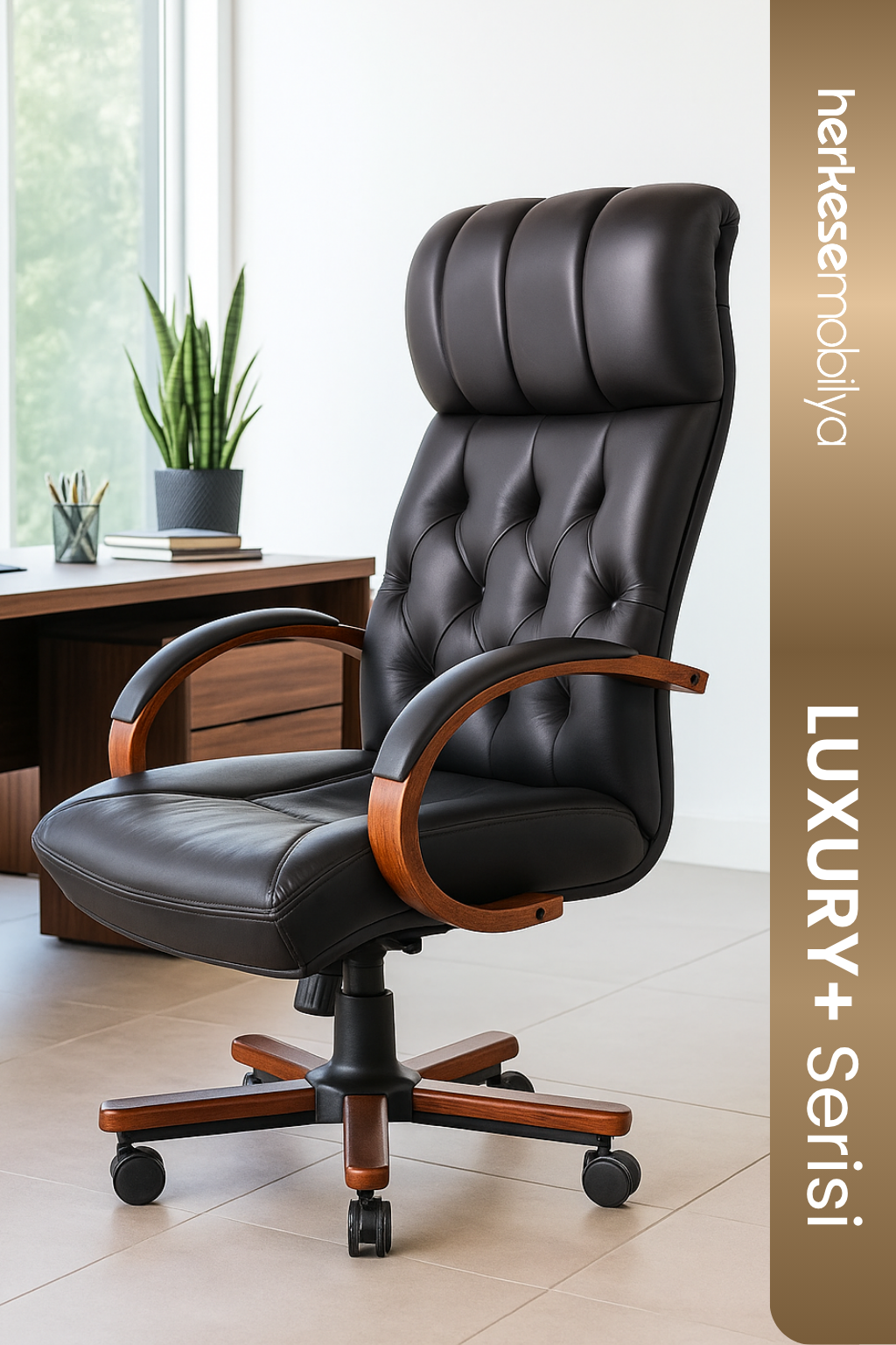 - ✔ Zarif Tasarım: Ahşap kolçaklar ve şık deri detayları ile ofisinize prestij katar.