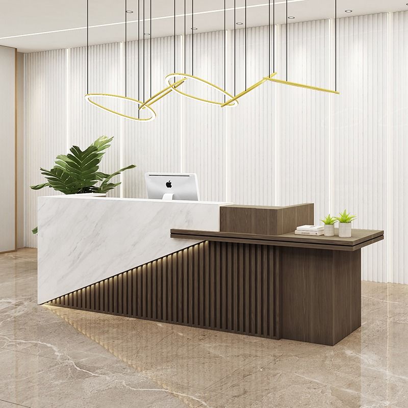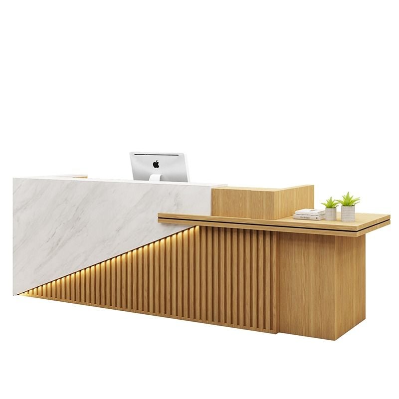 Görselde öne çıkan Prime Banko, asimetrik tasarımıyla sıradan ofis mobilyalarından ayrılır. Ürünün sol tarafında kullanılan beyaz mermer desenli panel, kurumsal bir ciddiyet ve zarafet simgelerken; sağ taraftaki doğal ahşap çıtalı (slat) yapı, mekana sıcaklık ve samimiyet katar. Bu iki zıt dokunun diyagonal bir kesimle birleşmesi, ofisinize dinamik ve modern bir sanat eseri havası verir.